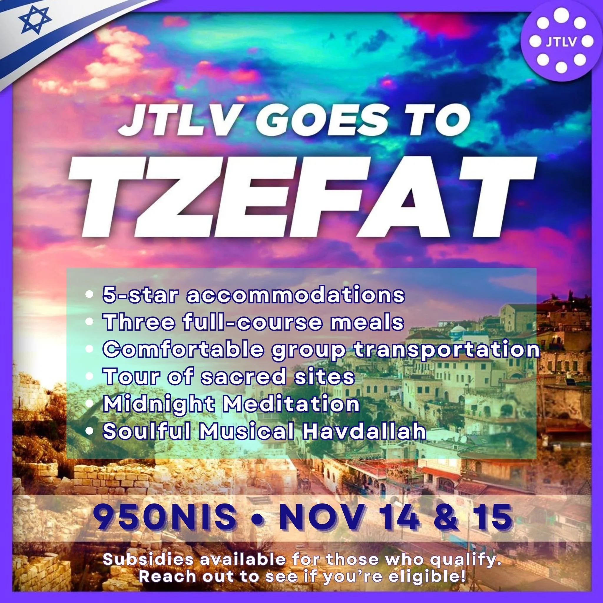 For just 950 shekels you have the opportunity to experience the beautiful atmosphere of the mystical city of Tzefat and spend Shabbat with great company, meeting new people from around the world.